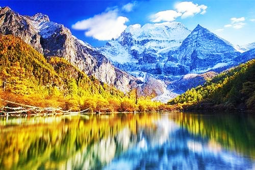 In summer, the landscape is filled with fresh green, dotted with scattered wildflowers adorning the emerald grasslands, contrasting with the snowy white peaks in the distance.